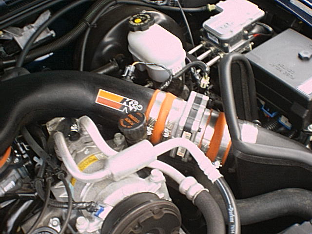 This piece comes from the other side of the mass air sensor and flows down into the filter. The filter has a sexy chrome end with K&N engraved on it, but you cant see it because it points down. |