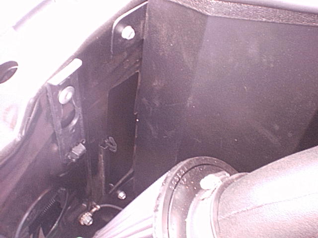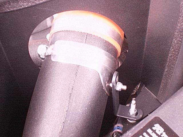 It attaches to the factory stud that held down the airbox. I think I used a 95 mm clamp here also. It uses the countersunk (or flathead) screw. The bracket is pressed so the screw fits flat, and a special insert make the back of the bracket flat where it attaches to the angle on the stud.